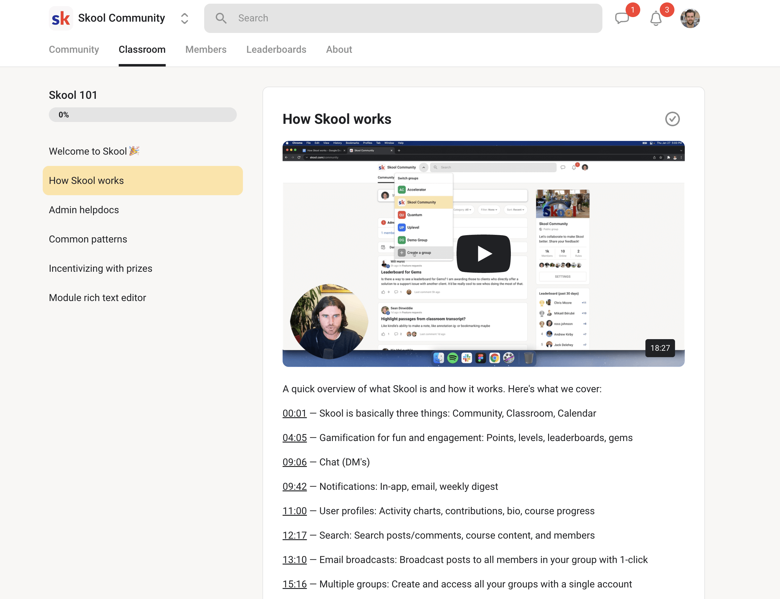 Concrètement, Skool est une plateforme tout-en-un qui fusionne les fonctionnalités d’un :